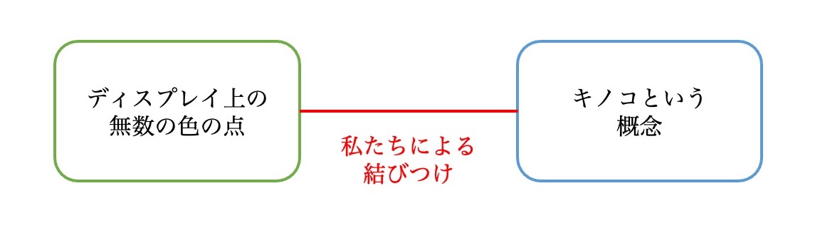 では「これはキノコだな」という判断の根拠はどこにあるのだろうか。それは、私たちの側にある。ディスプレイ上の色付けられた無数の点を見て、私たちはそこにキノコという対象があると考える。別の言い方をすれば、私たちは、「ディスプレイ上の無数の色の点」と「キノコ」を結び付けているのである。